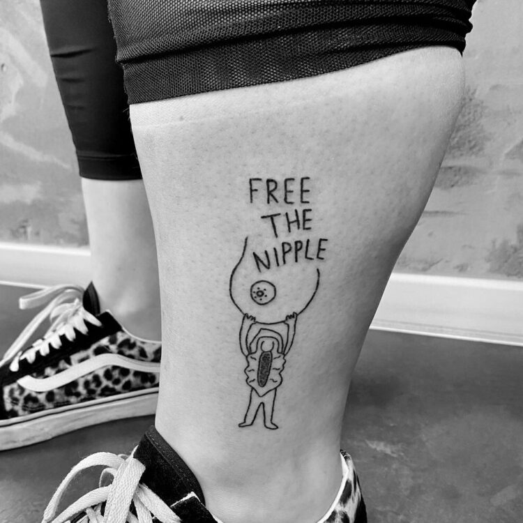Einige Zeit verging und Nikkel hatte sein erstes Tattoo Motiv fertig gezeichnet. Eine Vulva mit Armen und Beinen, die auf einem Skatebord fährt. Gezeichnet nur mit Außenlinien und zack war Dennis auch schon um ein Tattoo reicher.